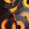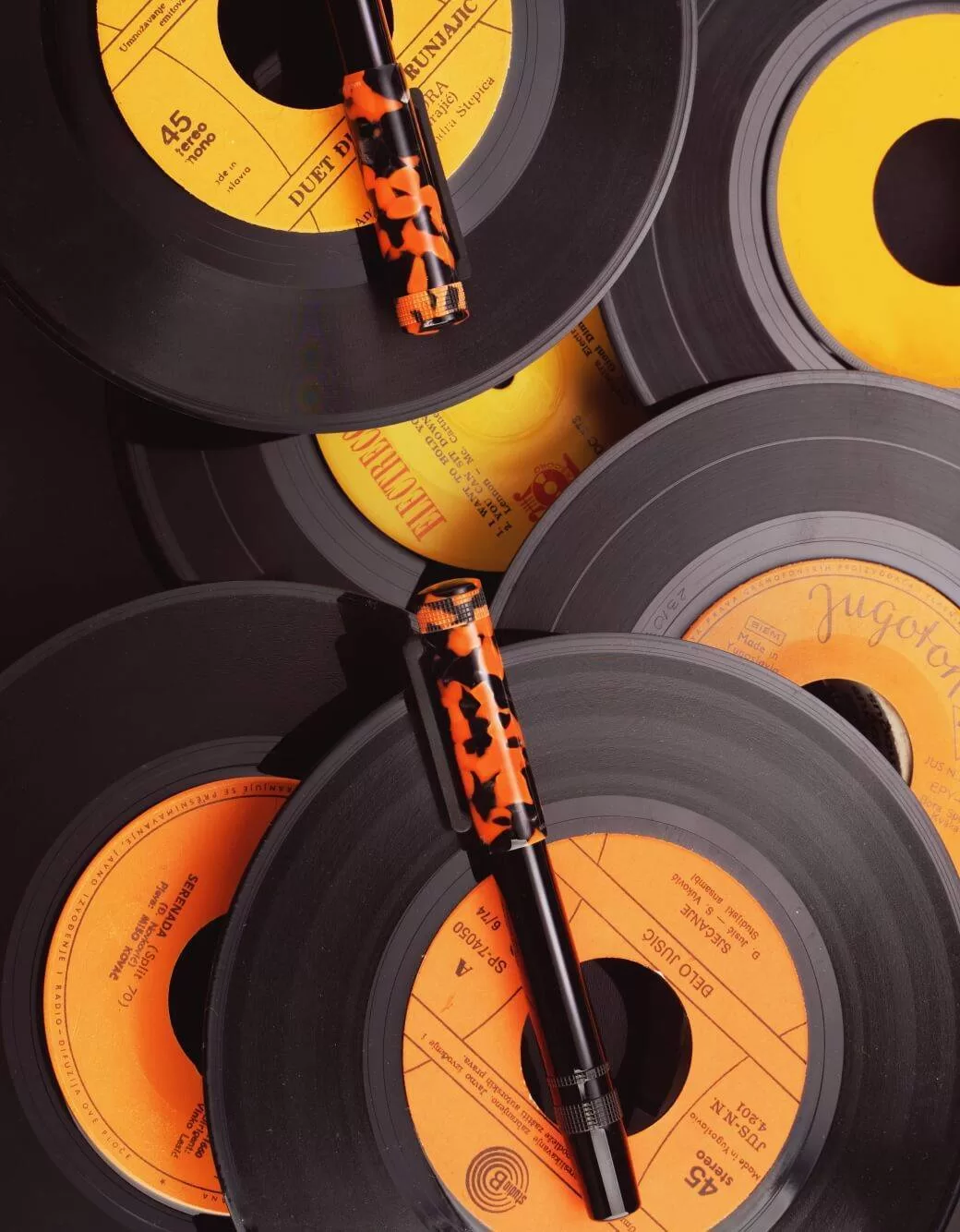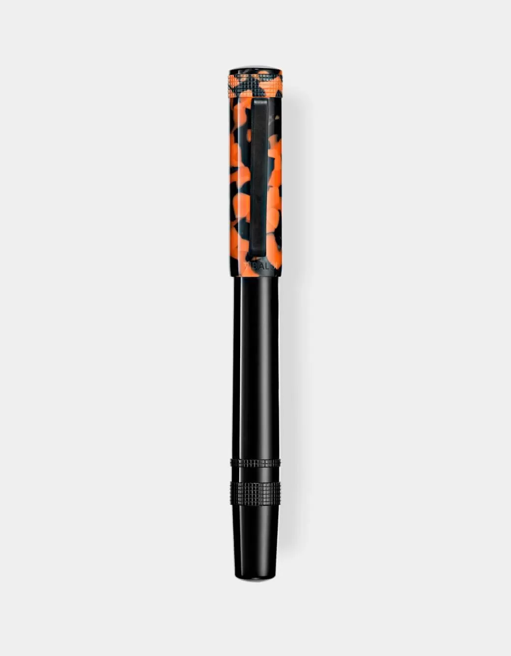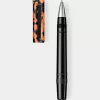 Rich Black and LP Vinyl Orange resin rollerball pen with rubber clip